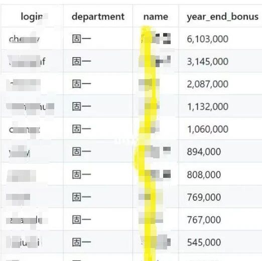 还有一张网传图片列出了固一部多名员工的年终奖明细,奖金最高的为610万元,最低为49万元。